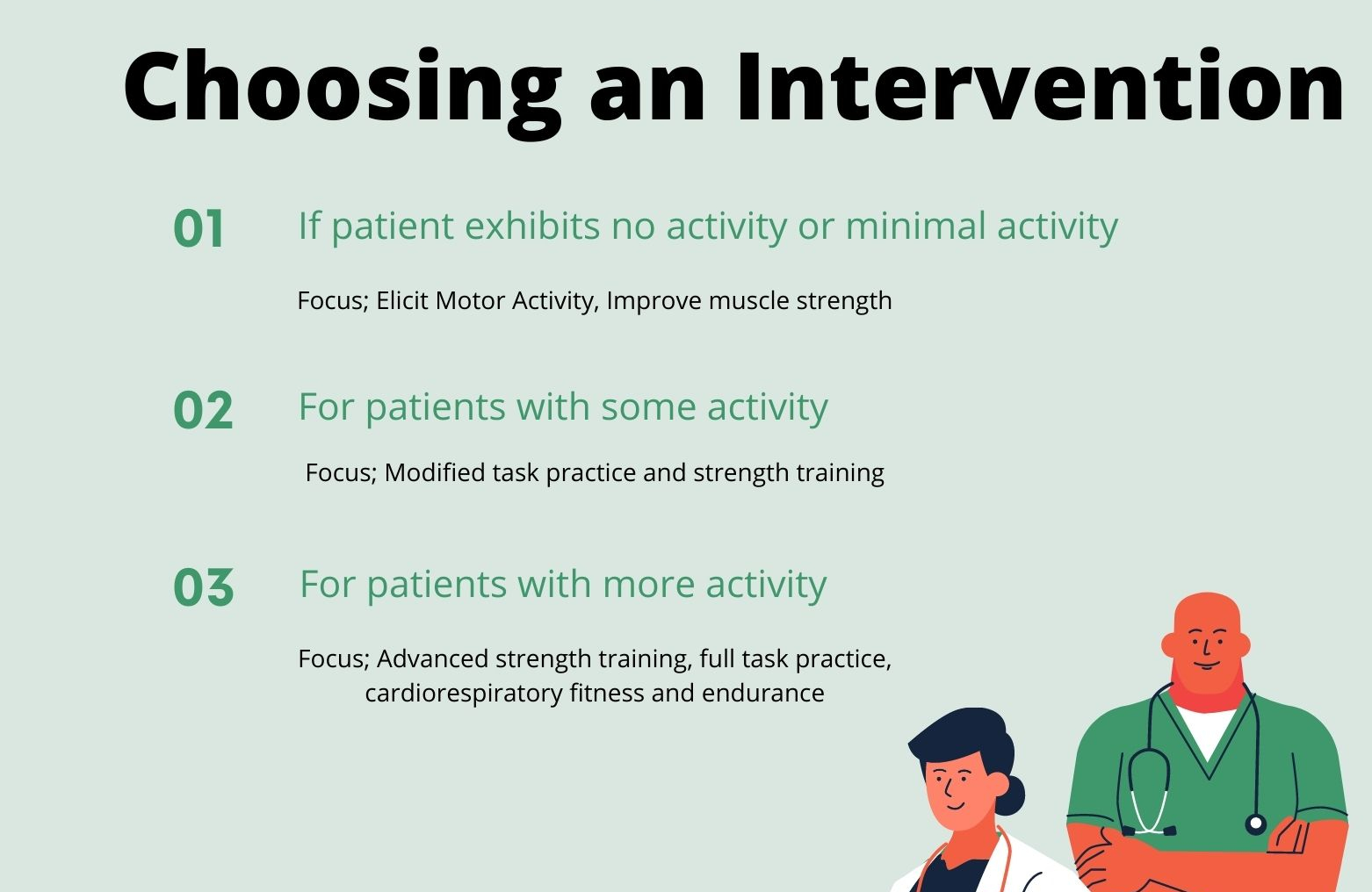 The treatment interventions that the physiotherapist starts with will essentially depend on the patient’s starting level of motor activity.(Kilbride & Cassidy, 2009)